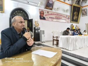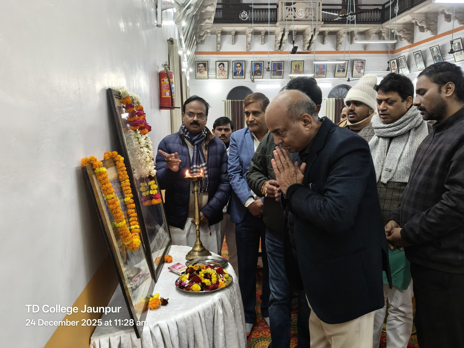 संकल्प सवेरा, जौनपुर।  तिलकधारी पीजी कॉलेज परिसर में आज दिनांक 24 दिसम्बर को पूर्व प्रधानमंत्री स्व श्री अटल बिहारी वाजपेयी जी के जयंती समारोह पर कार्यक्रमों का आयोजन कराया गया जिसमें सुशासन का महत्व विषय पर भाषण प्रतियोगिता तथा स्व श्री अटल बिहारी वाजपेयी जी के जीवन से संबंधित काव्य पाठ प्रतियोगिता का आयोजन कराया गया जिसमें अनेक प्रतिभागियों ने पूरे जोश एवं उत्साह के साथ प्रतिभाग किया। कार्यक्रम में छात्रों को संबोधित करते हुए प्राचार्य प्रोफेसर (डॉ) राम आसरे सिंह ने कहा कि छात्र अपने जीवन में जो भी अच्छे व्यक्तित्व मिलें उनका अनुकरण करें,क्योंकि कोई भी महान व्यक्ति जीवन में किसी न किसी का अनुकरण करके ही सीखा होता है। वाजपेई जी ने जवान जय किसान के नारे के साथ जय विज्ञान भी जोड़ा।
