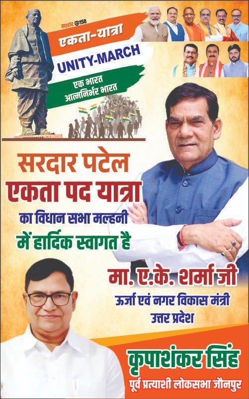 जौनपुर, संकल्प सवेरा: सरदार पटेल के 150 वी जयंती के सुभ अवसर पर मल्हनी विधानसभा में एकता पद यात्रा आयोजितसुबह ११ बजे किया गया है जो अम्बेडकर प्रतिमा लखनी पुर से शुरु होकर गन्ना धर्म काटा सलारपुर नीयर पेट्रोल पम्प पर समाप्त होगी