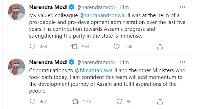 इसके साथ ही पीएम ने पूर्व सीएम सर्बानंद सोनोवाल के लिए भी ट्वीट किया. पीएम ने लिखा कि – ‘मेरे अमूल्य सहयोगी सर्बानंद सोनवाल जी पिछले पांच वर्षों में एक जन-समर्थक और विकास-समर्थक प्रशासन के मुखिया थे. असम की प्रगति और राज्य में पार्टी को मजबूत बनाने के लिए उनका योगदान बहुत बड़ा है.’