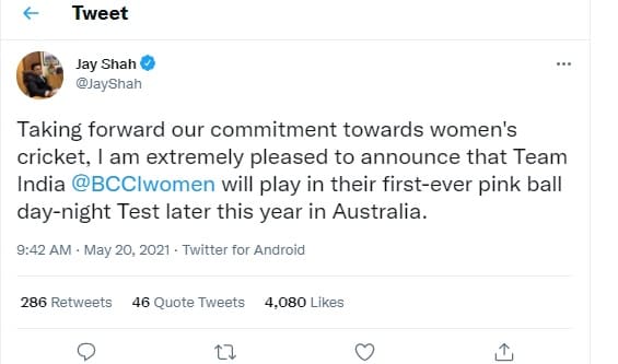 संकल्प सवेरा, नई दिल्ली. भारतीय महिला क्रिकेट टीम अगले महीने इंग्लैंड में टेस्ट मैच खेलने के बाद इस साल ऑस्ट्रेलिया का भी दौरा करेगी. ऑस्ट्रेलियाई दौरे पर पहली बार भारतीय महिला क्रिकेट टीम पिंक बॉल से टेस्ट मैच खेलेगी. यह टेस्ट मैच दूधिया रोशनी में खेला जाएगा. इस बात की जानकारी बीसीसीआई के सचिव जय शाह ने दी है. ऑस्ट्रेलिया दौरे पर भारतीय टीम एक टेस्ट खेलेगी, जबकि वनडे और टी-20 इंटरनेशनल मैचों में भी हिस्सा लेगी. भारतीय महिला टीम ने ऑस्ट्रेलिया के खिलाफ पिछला टेस्ट 2006 में खेला था. पिछले साल भारतीय पुरुष टीम ने भी पहली बार विदेशी धरती पर ऑस्ट्रेलिया के खिलाफ ही पिंक बॉल टेस्ट मैच खेला था.