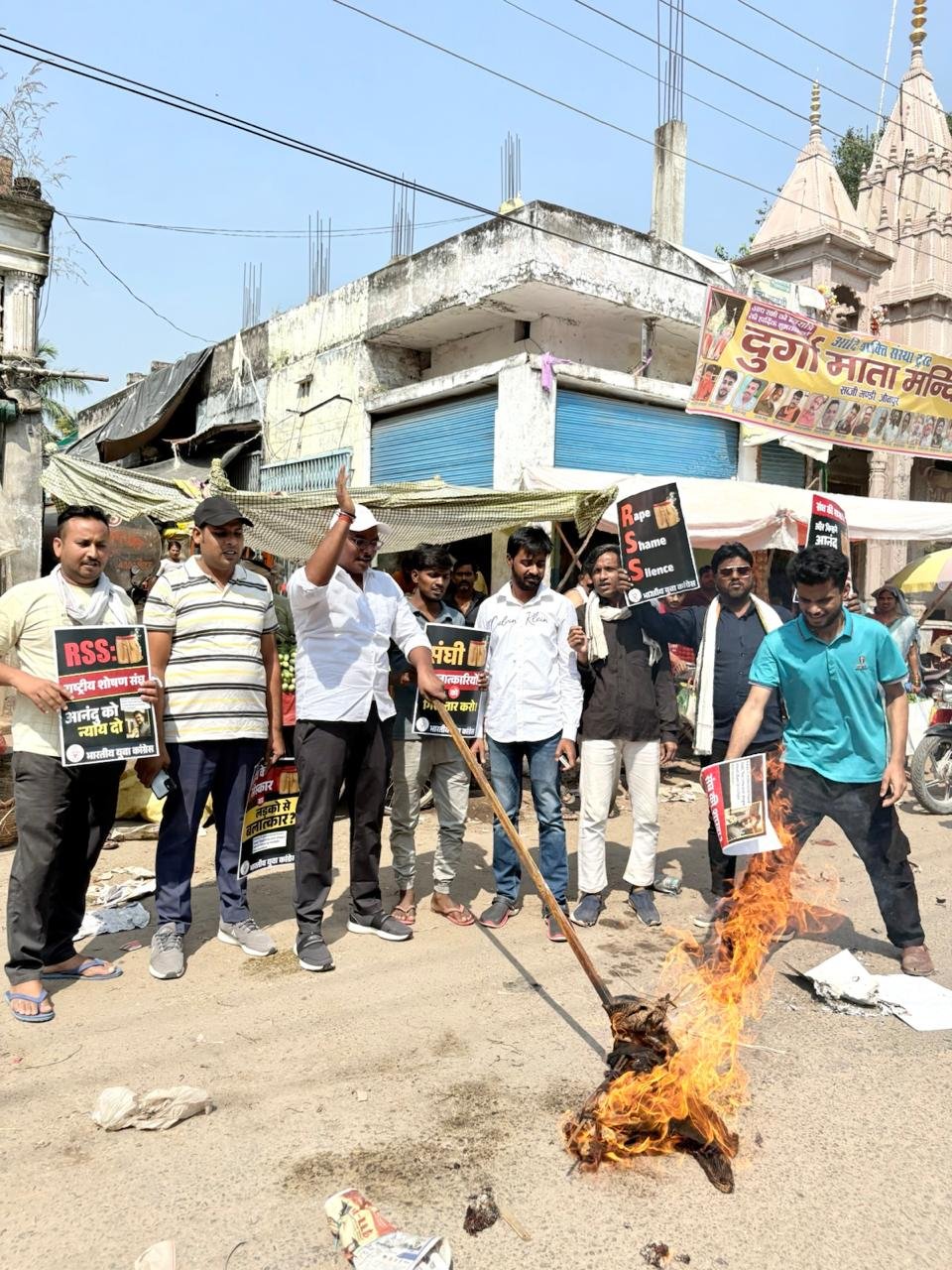 संकल्प सवेरा, जौनपुर। यूथ कांग्रेस ने पुतला जला कर किया राष्ट्रीय सेवक संघ का विरोध। जिलाध्यक्ष संदीप सोनकर के नेतृत्व में सब्जी मंडी चौराहे पर RSS प्रमुख मोहन भागवत का पुतला दहन कर विरोध प्रदर्शन किया गया। आनंदु अजी के न्याय के लिए सड़कों पर उतरे युवाओं ने नारे लगाए – “RSS के अत्याचार का अंत हो, आनंदु के हत्यारों को सजा मिले!” तथा “निष्पक्ष जांच हो, दोषी बच न पाएं!
